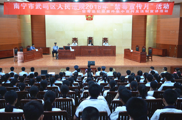 为加大对禁毒工作的宣传力度,提升未成年人对毒品危害及禁毒法律法规的认知程度,迎接第31个国际禁毒日的到来。6月21日上午,我院与武鸣区教育局联合开展2018年“禁毒宣传月”庭审观摩与法制教育活动。